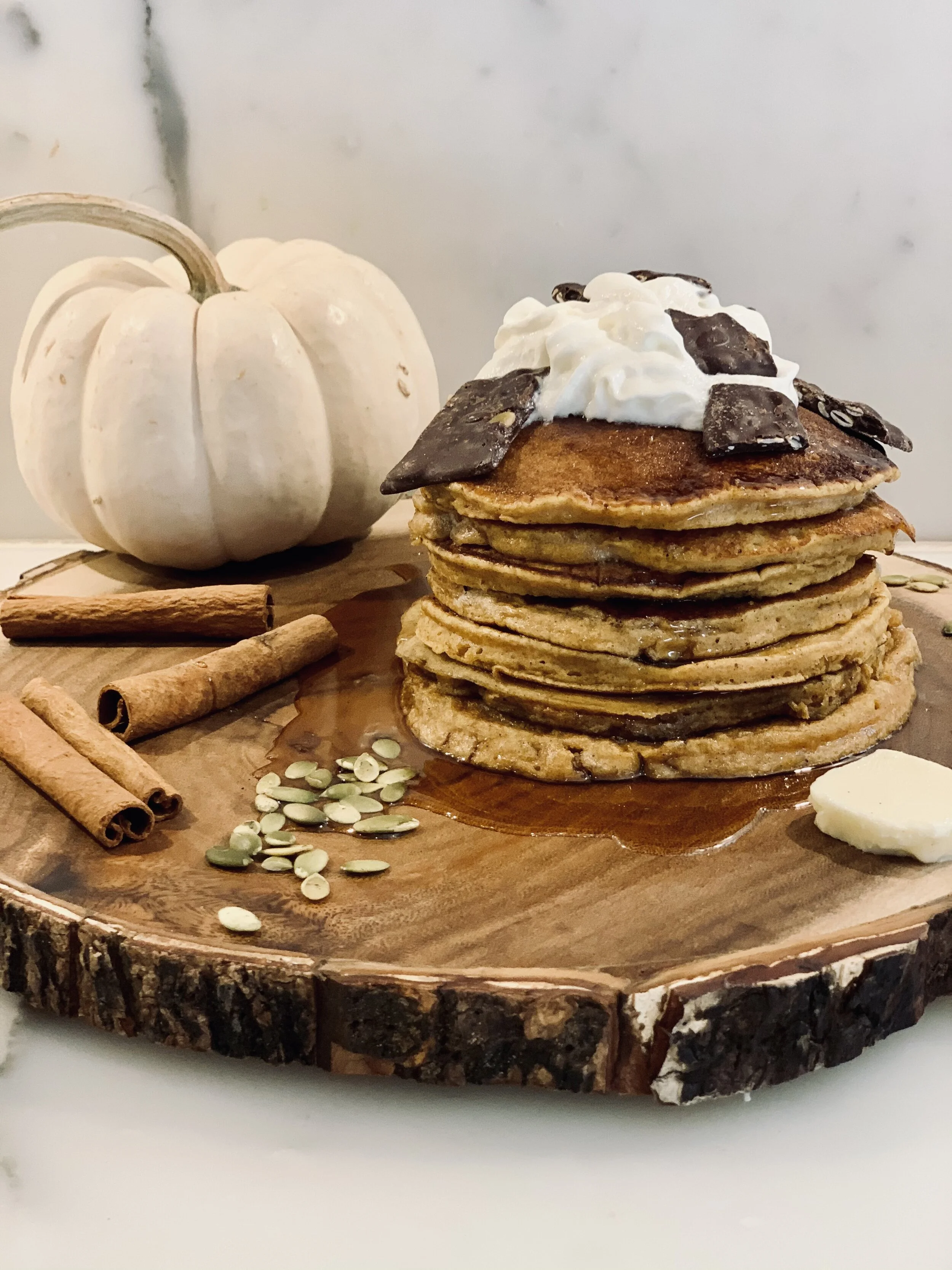 Pumpkin Pancakes with Whipped Cream and Chocolate Pumpkin Seed Bark